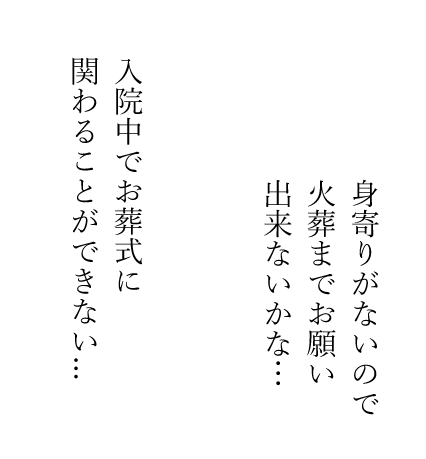 生活相談員の方や後見人として担当している行政書士・司法書士・弁護士の方よりご相談内容 「ご高齢でお葬式に携わる事が出来そうにない。火葬をしてお骨を持って来て欲しい。」